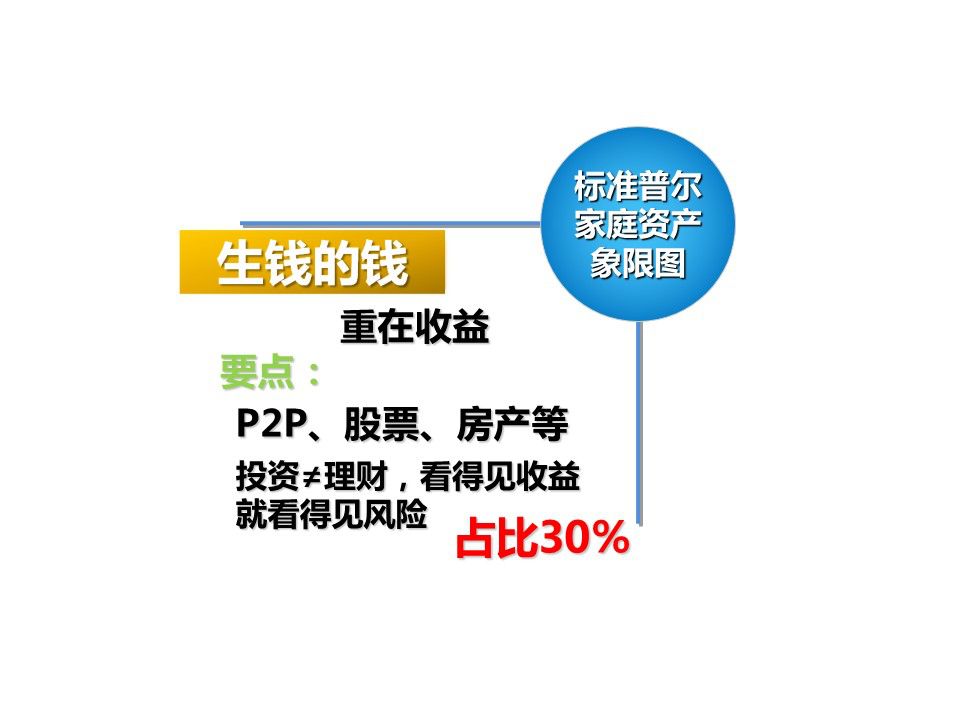 3、第三个账户是投资收益账户,生钱的钱,一般占家庭资产的30%,为家庭创造收益,例如P2P、房产、现货、外汇等。