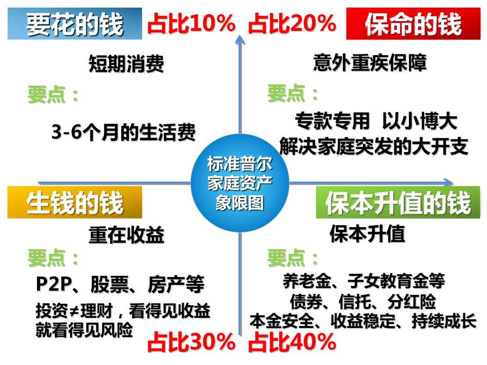 标准普尔家庭资产象限图把家庭资产分成四个账号,四个账号作用不同,资金的投资渠道也各不相同,只有拥有这四个账户,并且按照固定合理的比例进行分配才能保证家庭资产长期、稳定、稳健的增长。